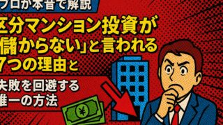 不動産投資 【プロが本音で解説】区分マンション投資が「儲からない」と言われる7つの理由と、失敗を回避する唯一の方法 「区分マンション投資は、やめとけ」…あなたも一度は、そんな言葉を耳にしたことがあるかもしれません。ネットや書籍には成功談が溢れる一方で、なぜ「儲からない」という声は後を絶たないのでしょうか? はじめまして。ファイナンシャルプランナーのまさと... 2025.09.06 不動産投資